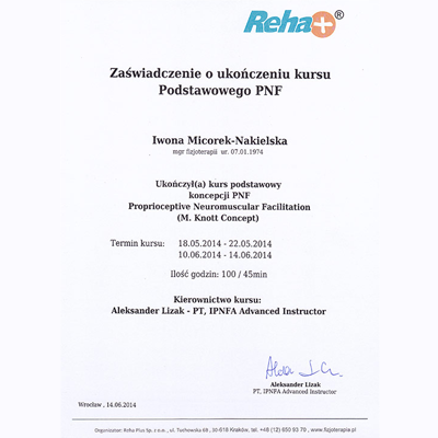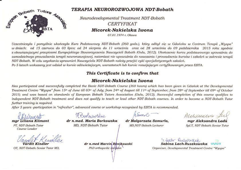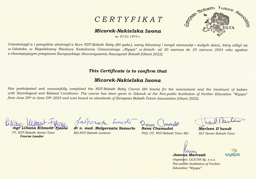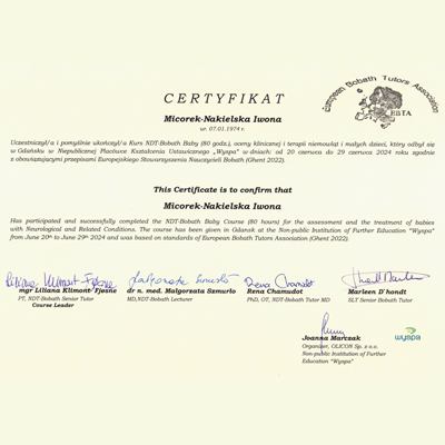 Specjalistyczna rehabilitacja dzieci i niemowląt metodą NDT-Bobath, rehabilitacja skolioz metodą FITS, korekta wad postawy metoda PNF, kinesiotaping, masaż Shantala dla dzieci i niemowląt.